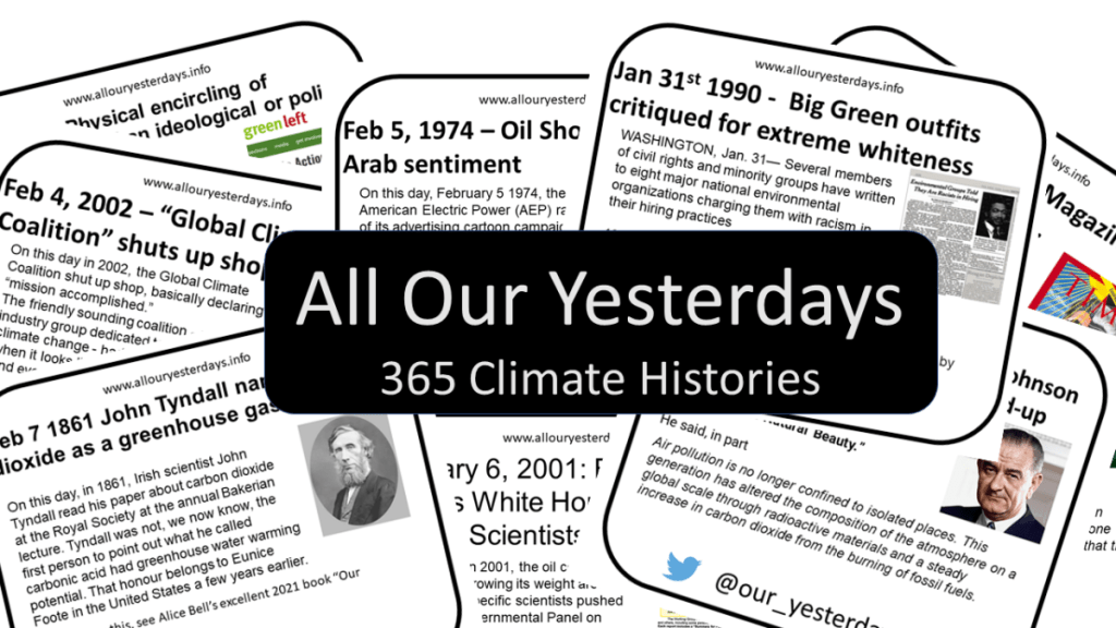 Very much appreciate this brilliantly written new book review from All Our Yesterdays, an innovative site keeping track of the recent and not-so-recent history of climate landmarks, climate action, and the sordid and continuing history of denialism on this planet. You can access the entire review here.