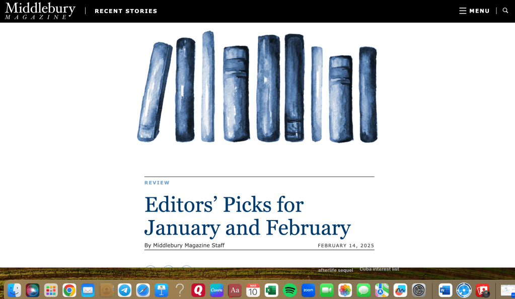 “The dangers [the characters] endure along the way are set against an unfolding and impossible love story across the vastness of geological time, as the scientists work to keep humans in existence. It may sound like an end-of-the-world tale, but it defines the strength and bravery of human beings and what they will do to preserve this precious thing we call life in the face of overwhelming odds.” — Middlebury Magazine