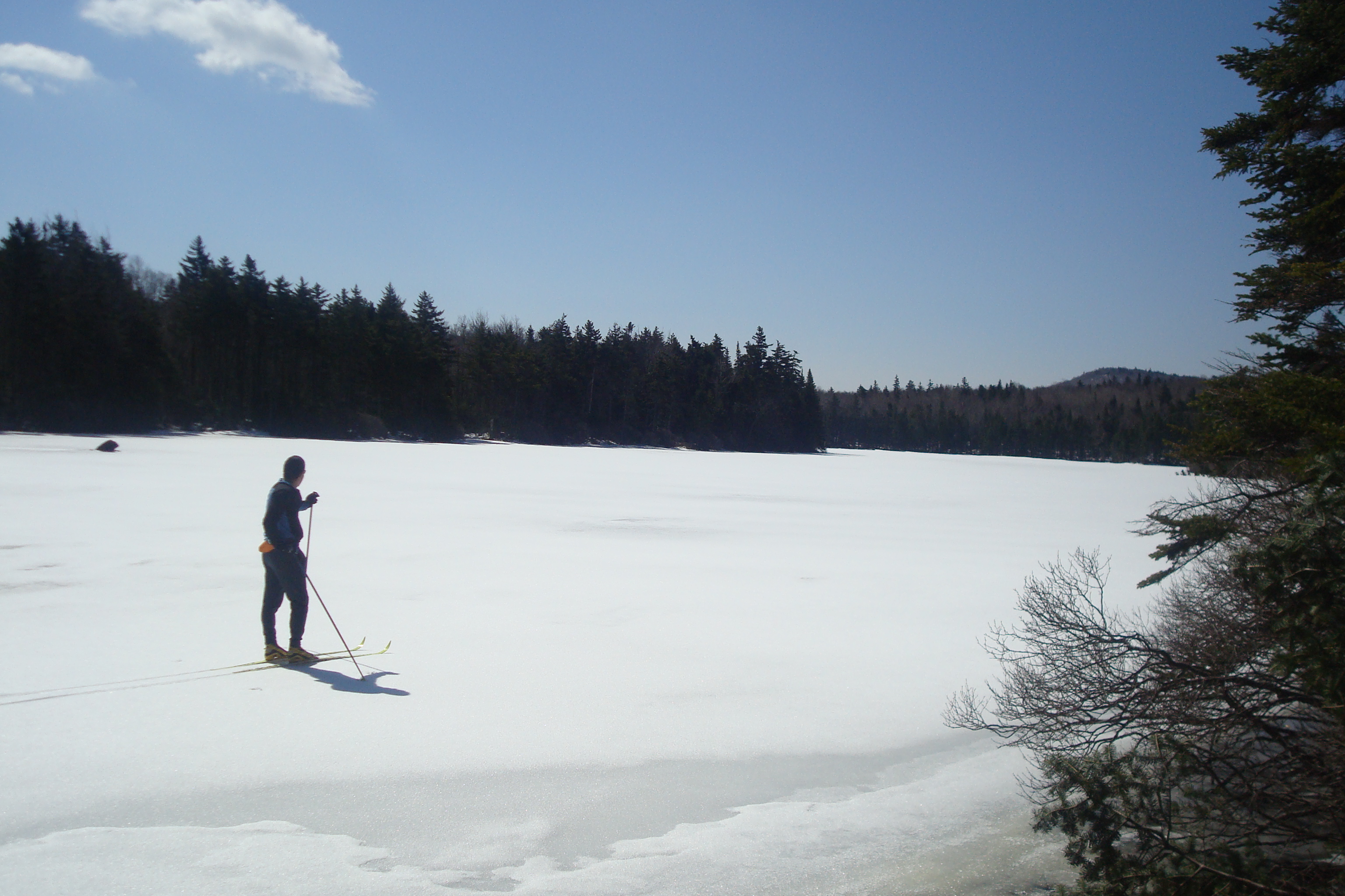 Then there’s spring corn. On March days between 9:30 AM and noon, the sun warms the upper layers of weight-supporting granular crust just enough to make for the most delicate skinny-ski tele turns imaginable. If the fields are good I’ll do multiple laps on my klister sticks, followed, perhaps, by a refreshing drink from a bucket of sap hooked to a stately maple. Later in the spring, north-facing forested slopes can be ideal for skate skiing. Who says you need a groomed trail? I keep a pair of rock skis mostly for this purpose. These slopes often retain their cover for weeks after it’s melted elsewhere. While others bitch about mud season you can be out weaving through the hemlocks, skipping over bare patches and exulting in the freedom of unencumbered movement through the Great Northern Forest.