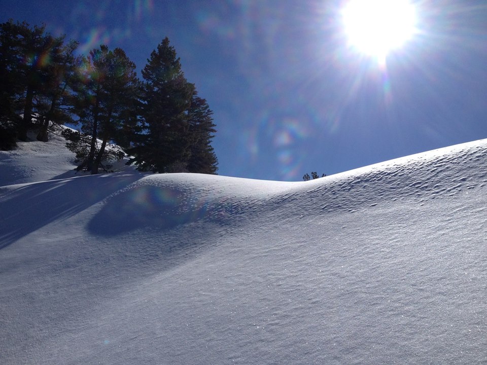 Our second run was called “Mandatory Air.” Unlike the first run, not many people had skied it before us, and we were able to make a thousand vertical feet of nice powder turns in a wide-open bowl. But it turned out the reason for the nice snow – and for the name – is that the bowl terminates in a cliff band. The only way out (other than the “mandatory air”) is that narrow chute spiraling down through the cliffs. It’s too steep to sideslip; you have to rappel it, after a fashion, by lowering yourself down a knotted climbing rope tied to a tree. This entails a series of jumps punctuated by digging your edges into the side of the slope, which is tricky, the snow long since having been scraped away to reveal the underlying roots and rocks.