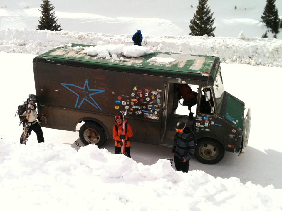 At the bottom of the run we skied out to the shuttle, an old UPS delivery truck plastered with stickers that started rolling backwards when we first got in. On the way up the road to the lift it seemed to be stuck in first gear. When it kicked up into second, both Troy and the driver broke out in surprised cheering. (The other shuttle was an ancient, revitalized school bus with a ski rack, and “Silverton Mountain Correctional Facility” painted on the side. But despite the mountain’s radically low-rent image, behind the equipment shack sat a pristine, bright yellow, $3 million helicopter that charged $159 for a single drop-off, $999 for a whole day.)