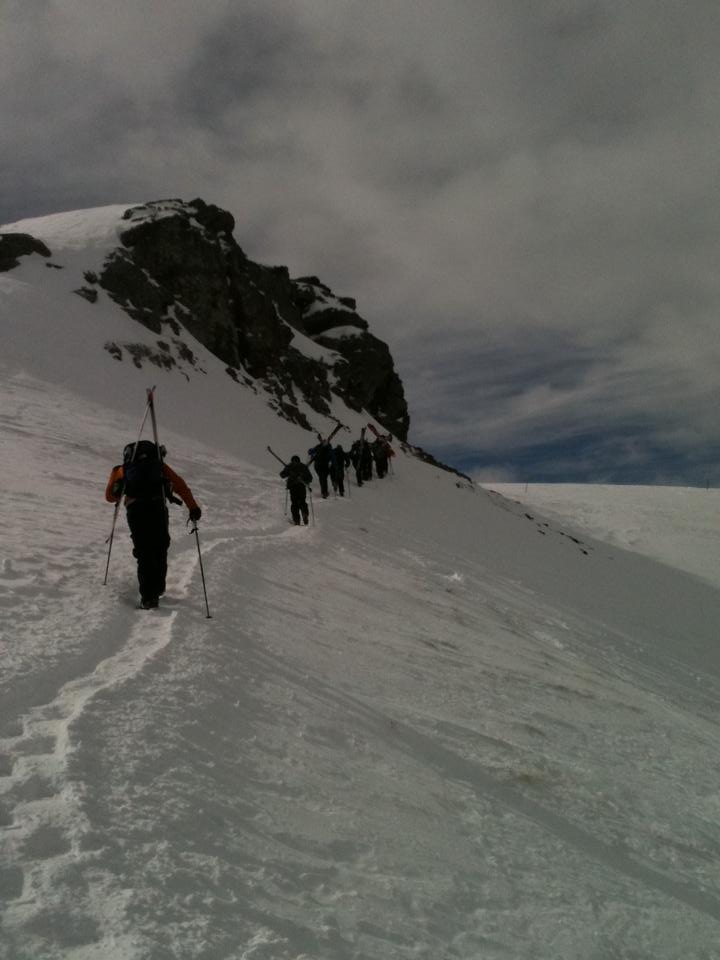 At the top of the lift we strapped our skis to our packs and started hiking. For Toby and I, who had come from sea level just a few days earlier, the first few steps at 12,000 feet were rough. After awhile we began to feel well enough to look around.