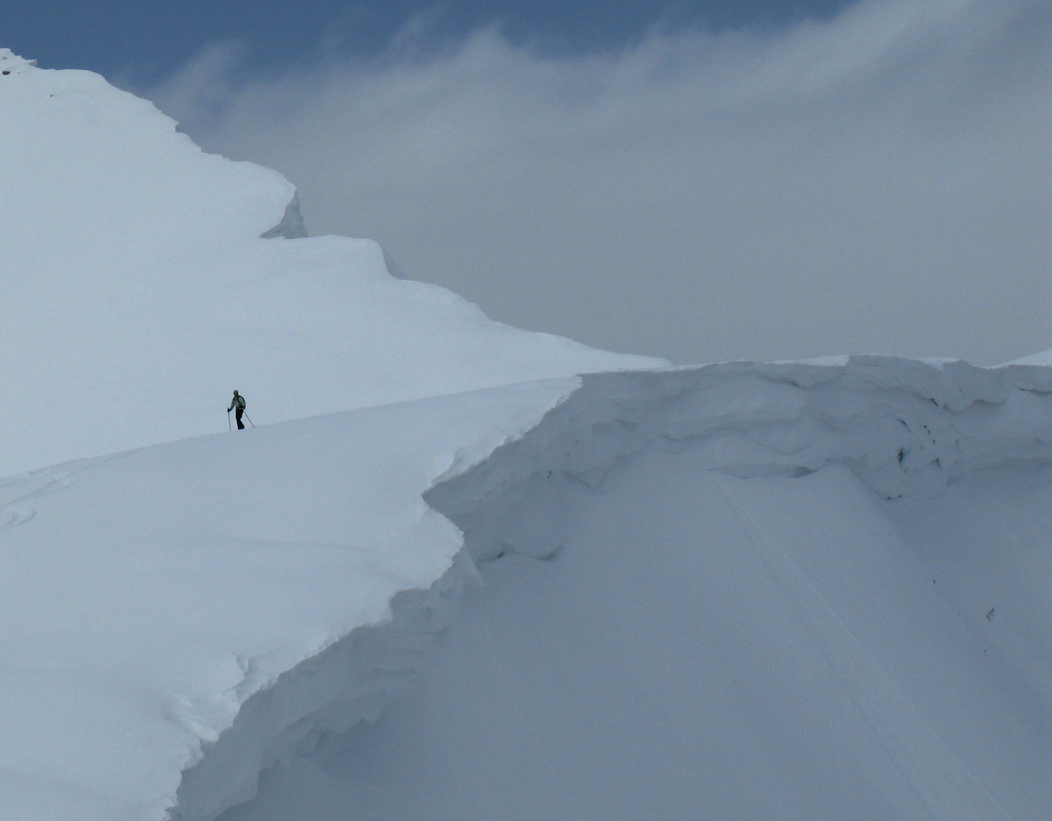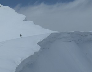 Darren goes first. After a few minutes an indistinct shout comes up from below. His voice does not seem distressed or panicked, so Tim follows, a little nervous but skiing fine down through a steep narrow chute curving gradually to the left.