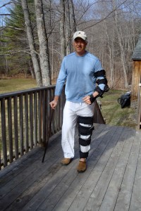 The next several weeks were a particular hell, in large part because of the pain and discomfort involved in simply getting up and sitting down. Because of the arm injury I couldn’t use crutches; I settled for hopping around on one foot with a cane for balance. The hardest thing was the sudden end to my ski season. Going cold turkey on that psychological addiction, especially with beautiful snow still falling, was like having my mental oxygen supply cut off.